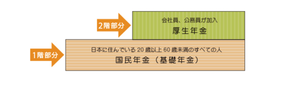 1階部分が「基礎年金(国民年金)」2階部分が「厚生年金、共済年金」となっています。